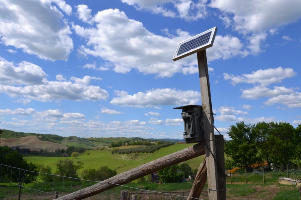 - Il loro funzionamento è semplice. E’ un sistema elettrico con batteria interna e ricaricabile anche con pannello solare e quindi posizionabile in area di pascolo. Al suo interno ha un lettore MP3, che permette la registrazione e poi l’emissione di suoni. La riproduzione del suono e/o l’attivazione delle luci è attivata da dei sensori di movimento che rilevano il passaggio di un animale. In commercio esistono anche sensori wireless, che possono essere posizionati ad una distanza consigliabile tra i 10 e 25 metri, al fine di aumentare il raggio di azione entro il quale, al passaggio di una animale, si attiva il dissuasore. Lo strumento è dotato anche di timer per la programmazione delle emissioni sonore e di un sistema di regolazione del volume.